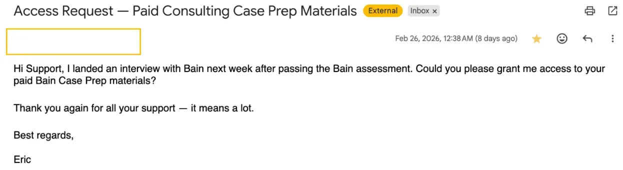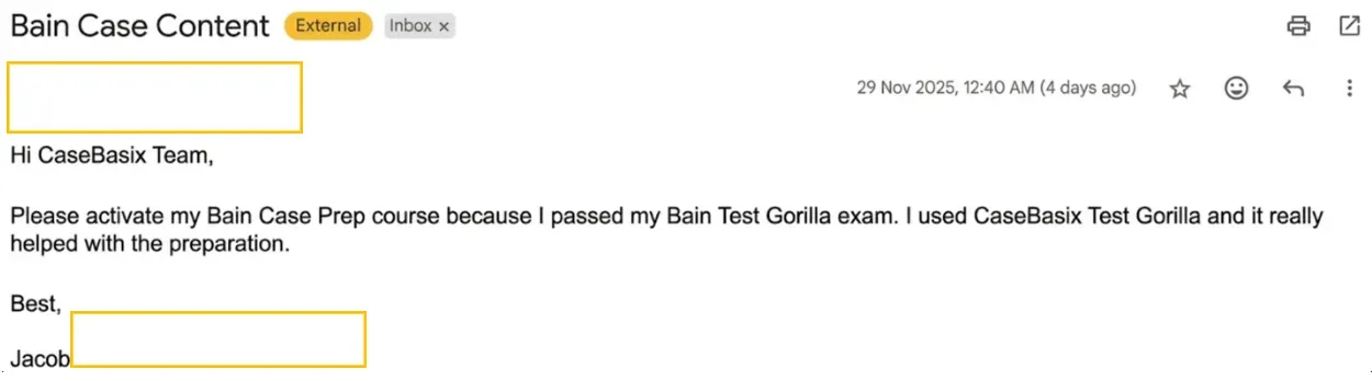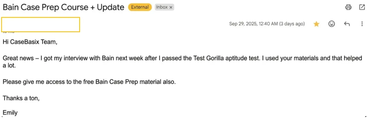"CaseBasix materials helped me pass the Bain TestGorilla assessment and secure an interview."