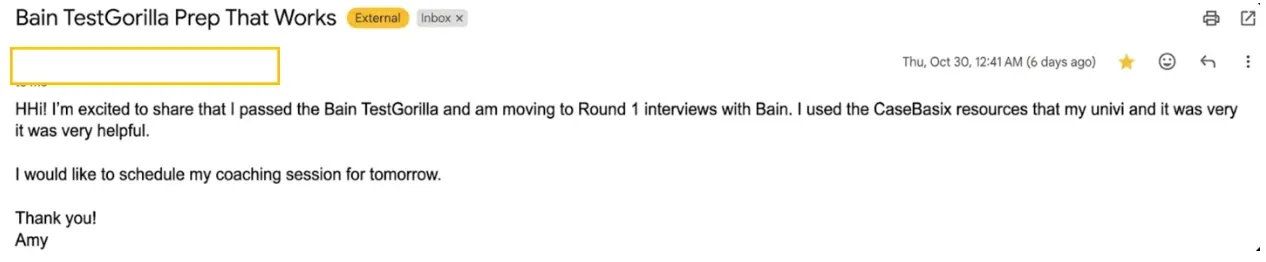 "CaseBasix resources helped me pass the Bain TestGorilla and move to Round 1 interviews."