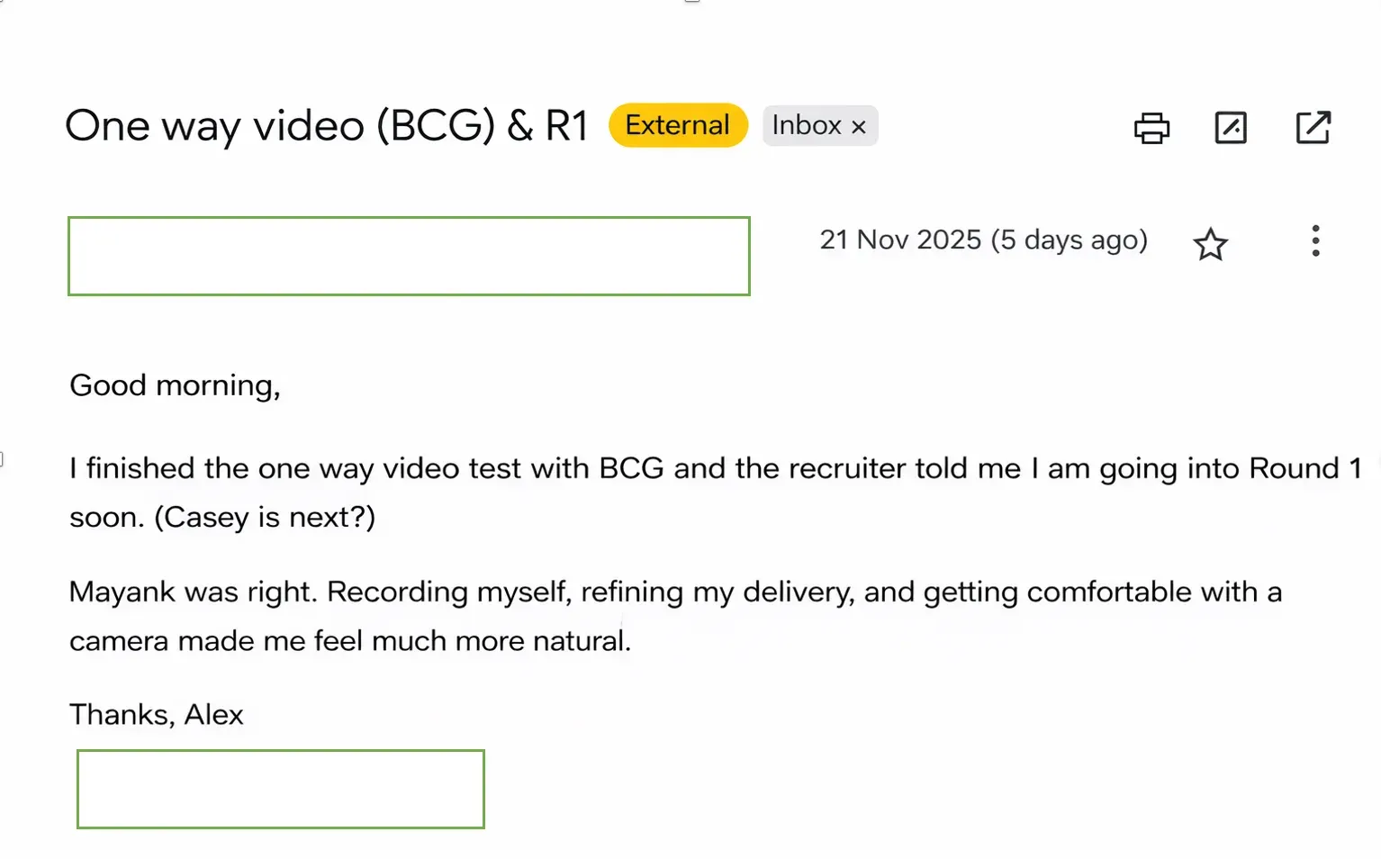 "Recording myself and refining my delivery helped me feel natural on camera and move into BCG Round 1."