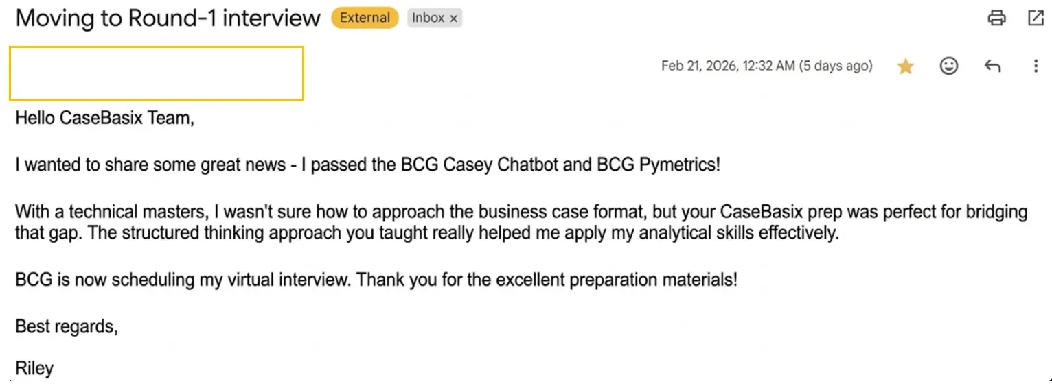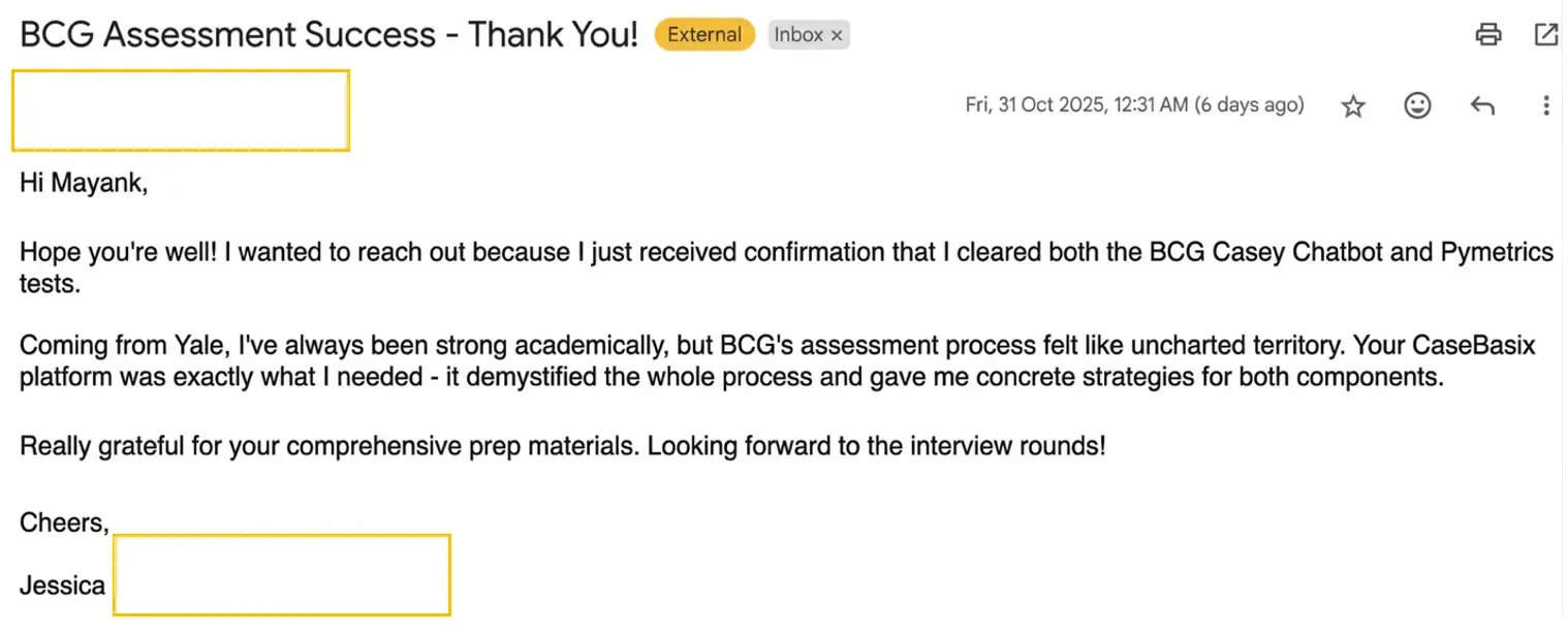 I was nervous at first, but CaseBasix’s BCG Pymetrics mock games prepared me so well that the real assessment felt manageable.