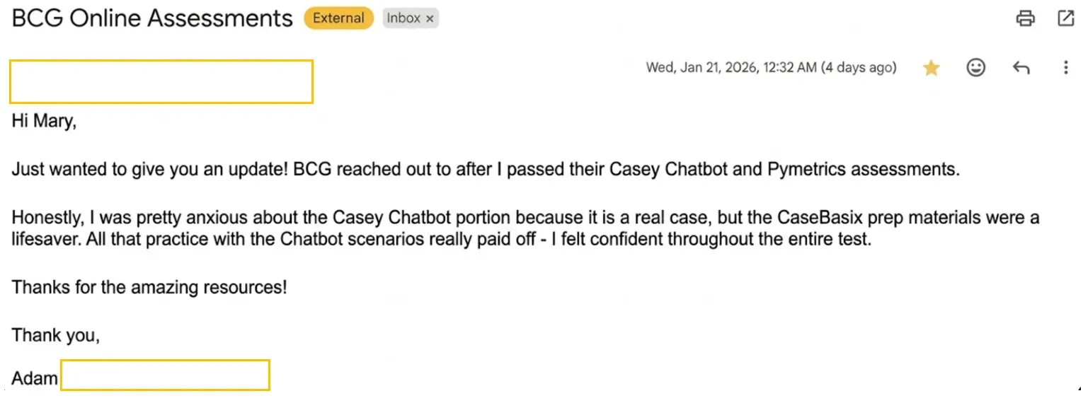 "CaseBasix practice with Casey Chatbot scenarios made me confident throughout the entire BCG test."