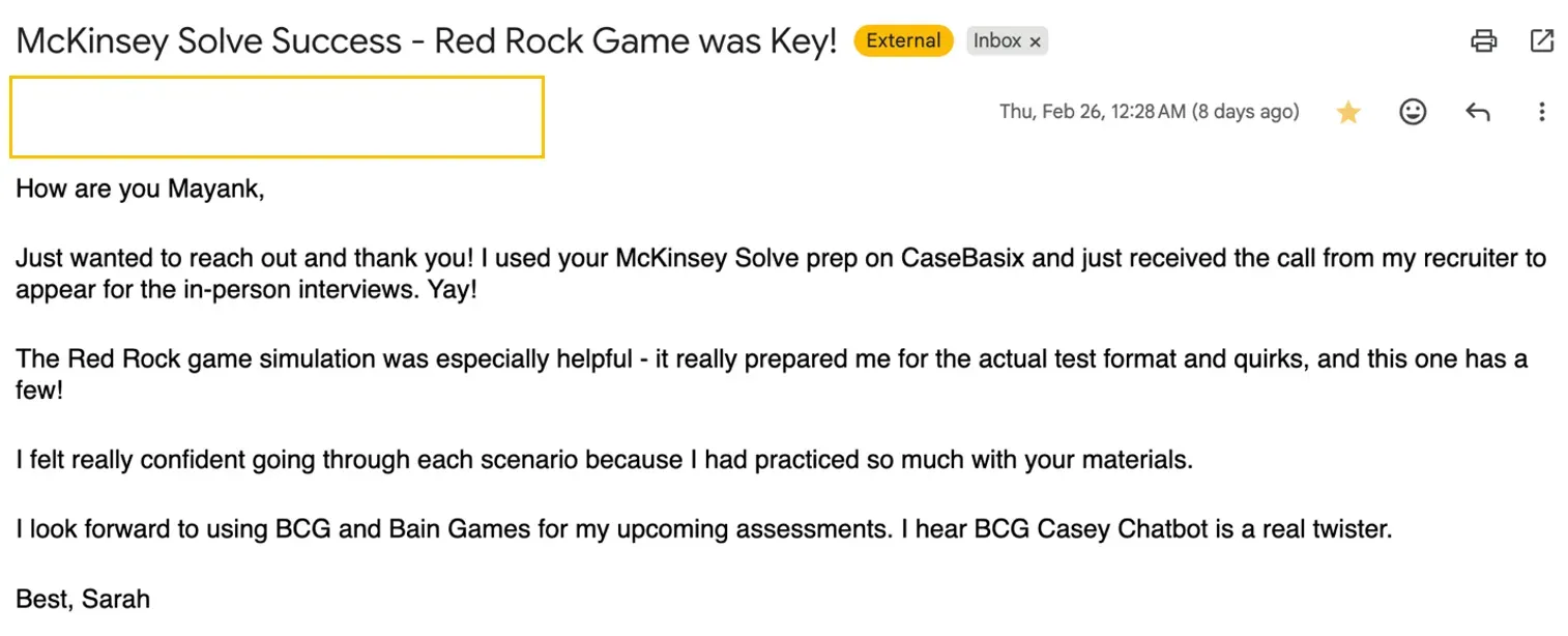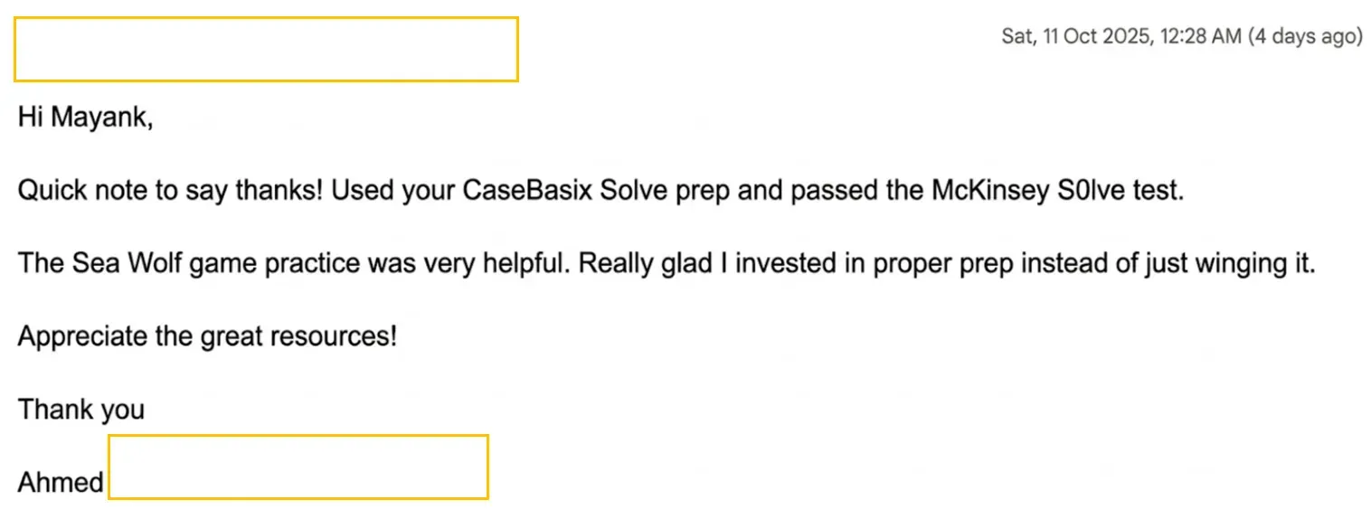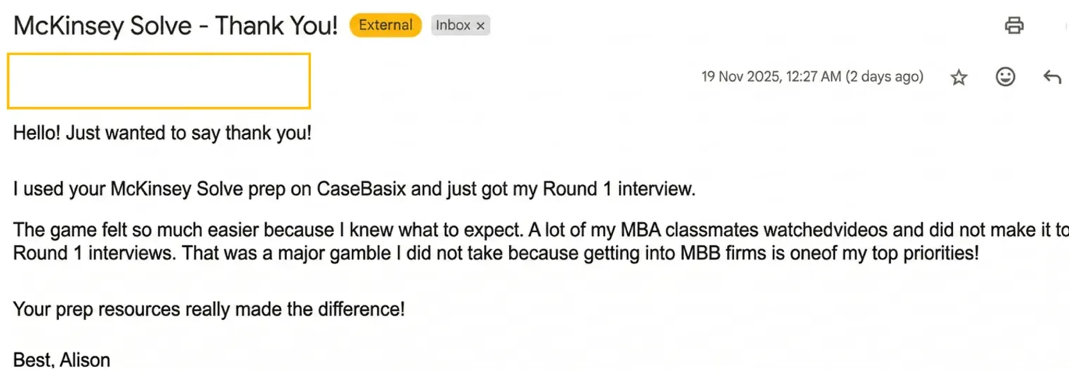 "CaseBasix McKinsey Solve prep helped me get my Round 1 interview.!"